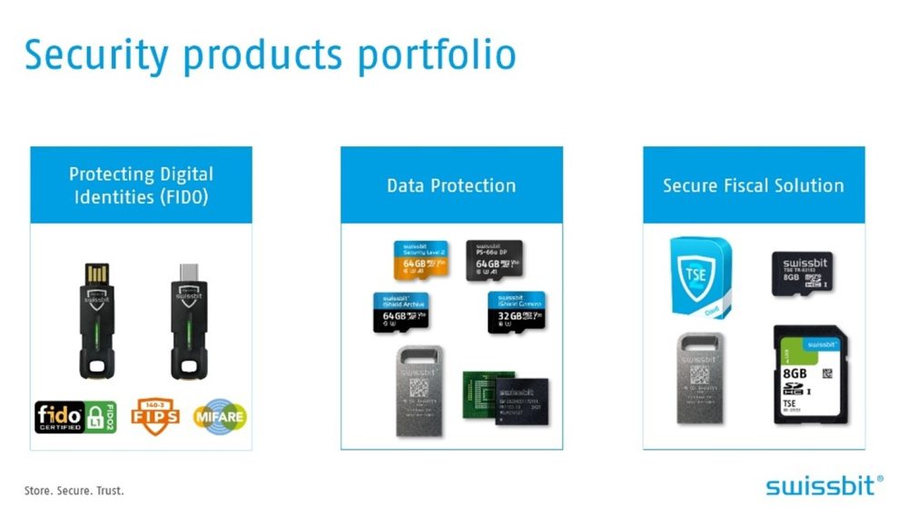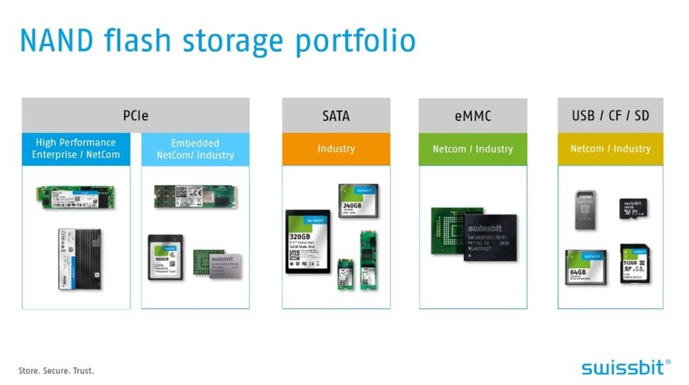 Swissbit’s storage range includes SSDs with PCIe and SATA interface such as mSATA, Slim SATA, CFast, CFexpress, M.2 and 2.5”, U.2, E1.S as well as CompactFlash, USB flash drives, SD Memory Cards, microSD Memory Cards and managed NAND BGAs like e.MMC.
