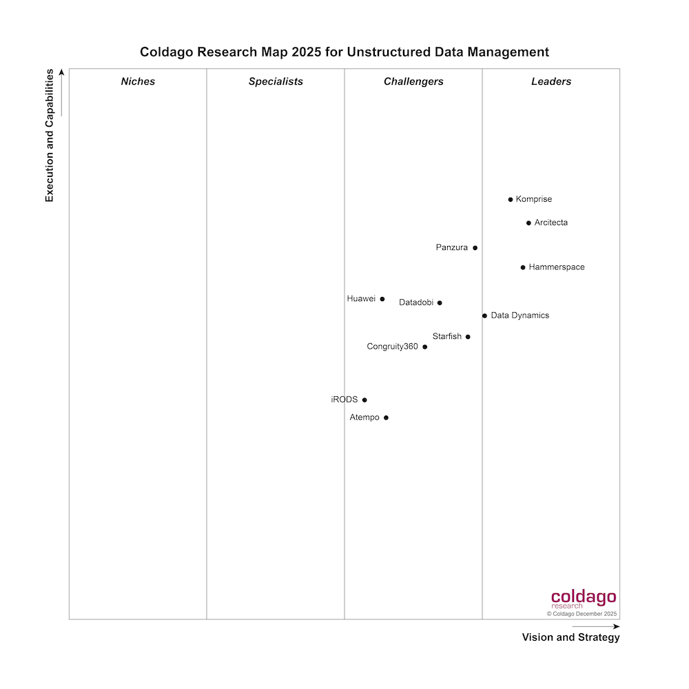 The 2025 edition selected and evaluated 11 vendors and identified 4 market leaders: Arcitecta, Data Dynamics, Hammerspace and Komprise.