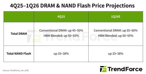 Conventional DRAM contract prices in 1Q26 are forecast to rise 55–60% QoQ, while NAND flash prices are expected to increase 33–38% QoQ