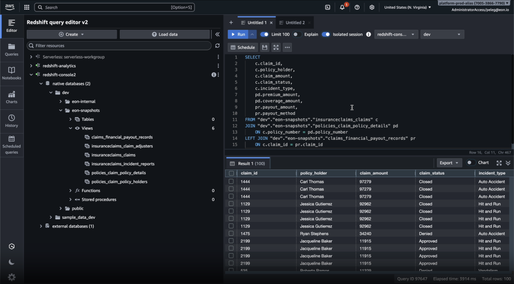 Eon integrates with Amazon Redshift, allowing you to query database backup data in place.