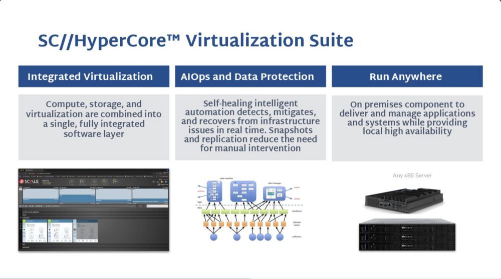 - Scale Computing HyperCore – Integrated virtualization suite combining compute, storage, and virtualization in a single software layer with self-healing automation and built-in data protection