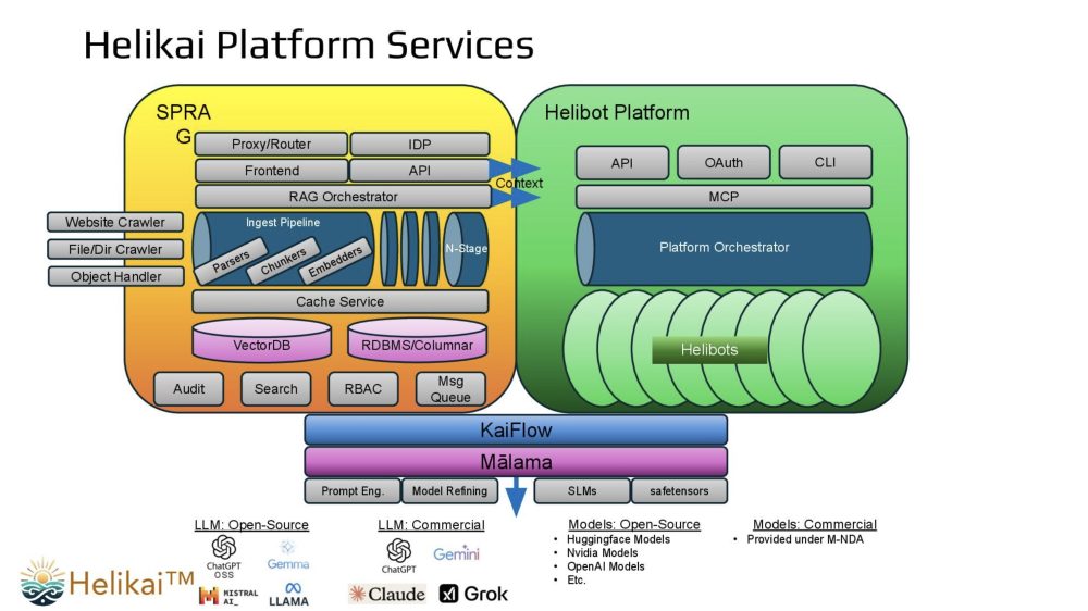 The Helikai platform is composed of several integrated components. Helibots are prebuilt AI agents tailored to specific workflows across enterprise IT, healthcare, media and entertainment, legal, and data infrastructure. SPRAG (Secure Private Retrieval Augmented Generation) connects large language models with private enterprise data in secure on-premises or isolated cloud environments, delivering grounded, traceable, and compliant outputs. KaiFlow provides a human-in-the-loop orchestration layer that embeds oversight, audit trails, and decision checkpoints into automated processes, while Mālama optimizes performance and resource efficiency to support scalable AI operations.