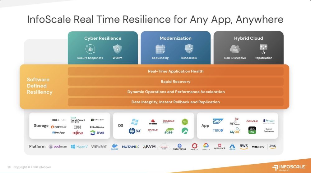The platform’s core approach is “software-defined resiliency,” which unifies application-aware clustering, storage resiliency, orchestration, failover, replication, snapshots, and automation into a single full-stack solution. InfoScale delivers real-time application health monitoring, fast recovery, data integrity protection, secure snapshots, and workload mobility across clouds, supporting near-zero RPO and RTO across heterogeneous operating systems, storage platforms, and cloud environments. By understanding and orchestrating dependencies across applications, data, and infrastructure, the platform enables automated failover, disaster recovery, and cyber resilience at enterprise scale.