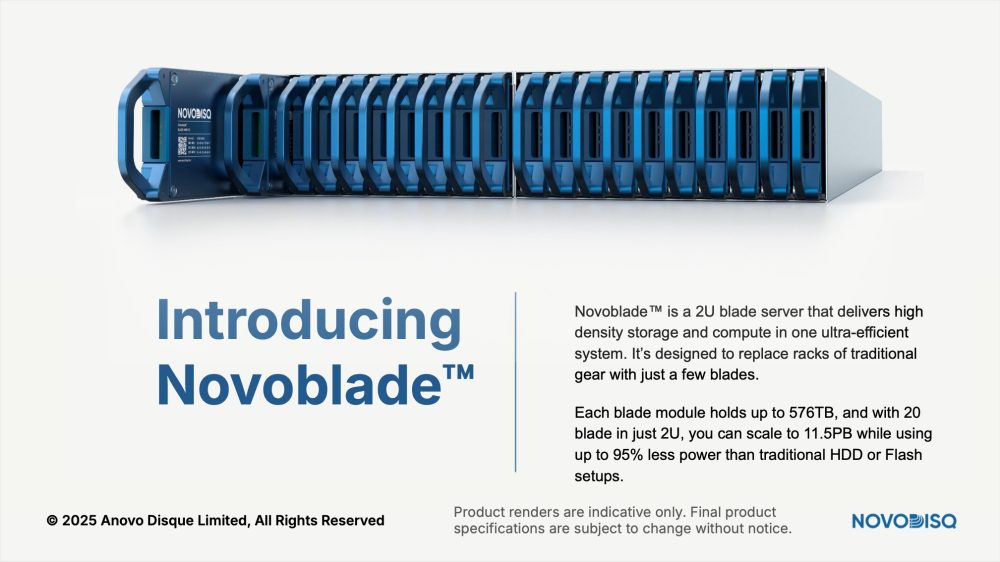 Novodisq’s solution is a vertically integrated, hardware-first architecture optimized for density, efficiency, and control. Its flagship product, Novoblade, is a 2U blade system that combines high-density storage and compute in a single chassis. Each blade delivers up to roughly 576 TB, and a fully populated 2U system scales to about 11.5 PB while consuming up to 90–95% less power than traditional HDD- or flash-based storage systems. The design prioritizes watts-per-petabyte efficiency, enabling deployments in power-constrained data centers, regional facilities, and edge environments.