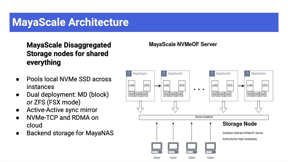 MayaScale targets low-latency workloads using local NVMe SSDs and NVMe-over-Fabrics. It supports both block and file modes for databases, analytics, Kubernetes, and FSx-like use cases. MayaScale uses server-side RAID-1 mirroring in active-active configurations, avoiding client-side replication overhead and delivering up to 2.3 million IOPS with sub-millisecond latency, with future RDMA support planned.