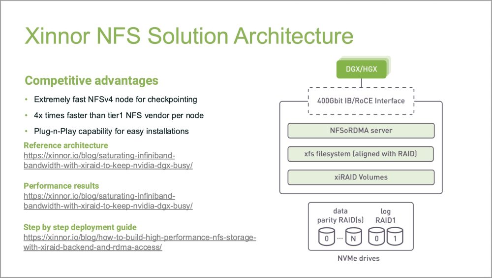 “xiNAS is designed to make NFS a performance enabler rather than a constraint for AI and HPC,” said Dmitry Livshits, CEO, Xinnor. “By tightly integrating xiRAID with an optimized filesystem and RDMA-enabled NFS, we deliver shared storage that keeps GPUs fed, scales linearly, and continues to perform even under real-world fault conditions.”