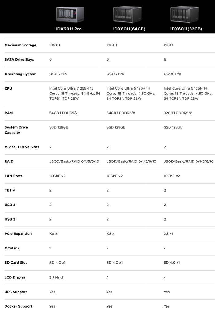 Up 196TB, with three models: NASync iDX6011 Pro 64GB RAM, and NASync iDX6011 with 64 or 32GB RAM