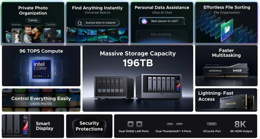 The NASync iDX6011 Pro, which is powered by an Intel Core Ultra 7 processor delivering up to 96 TOPS of compute, and features dual M.2 NVMe SSD slots along with 64GB of LPDDR5X memory as standard. With expandable storage up to 196TB, users can centrally manage photos, videos, and documents, while built-in on-device AI delivers smooth performance keeps data private. Built-in AI tools save time and boost productivity, including Universal Search, Uliya AI Chat, AI Album, Voice Memos, and File Organization. All processing for these practical features is done locally, keeping your data completely private and off third-party servers.