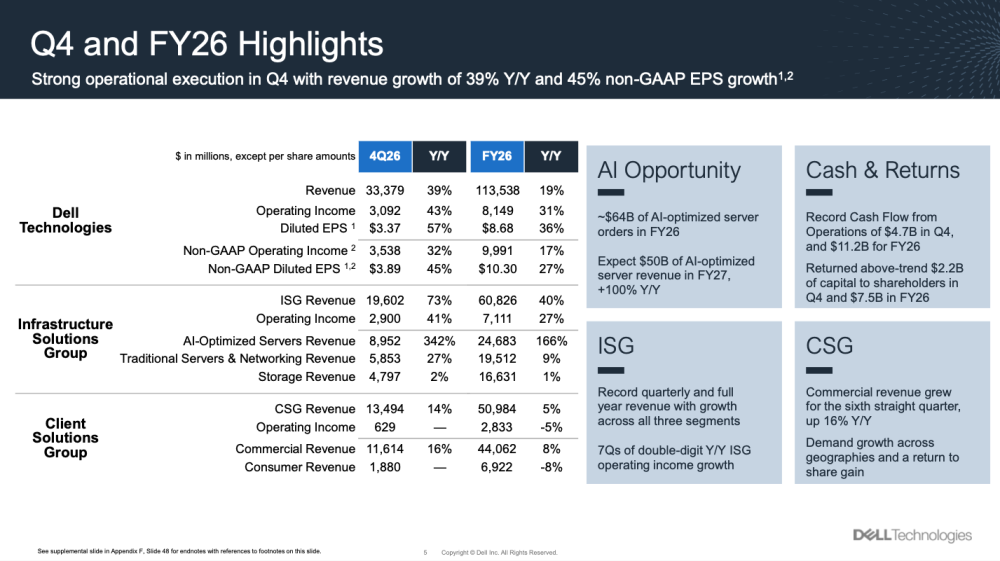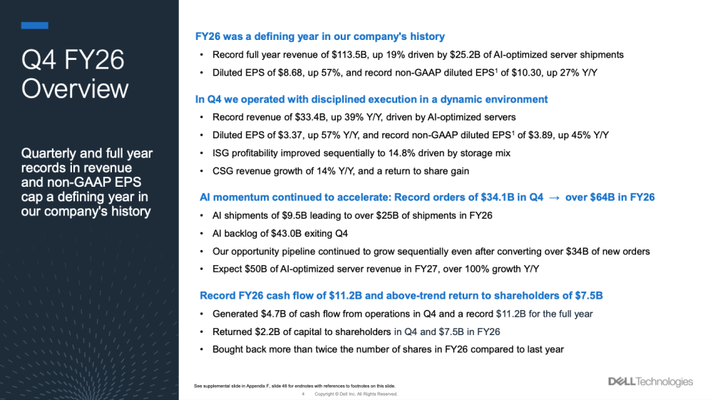 “FY26 was a defining year in our company’s history, with record full-year revenue of $113.5 billion, record EPS, and record cash generation,” said Jeff Clarke, vice chairman and COO, Dell Technologies. “The AI opportunity is transforming our company. We closed more than $64 billion in AI-optimized server orders, shipped more than $25 billion throughout the year, and are entering FY27 with record backlog of $43 billion – powerful proof that our engineering leadership and differentiated AI solutions are winning.”