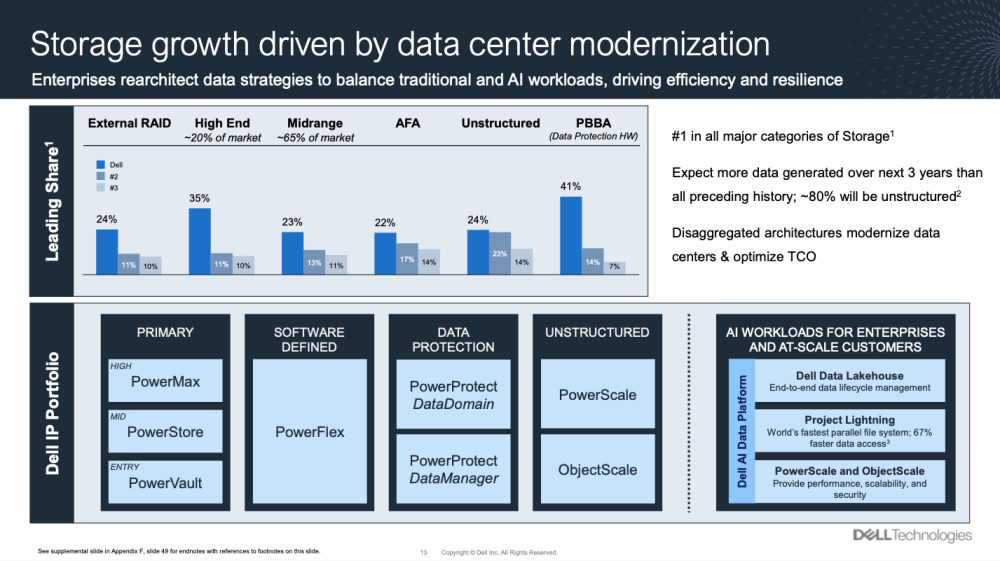 Despite its leadership positions, Dell has delivered relatively flat storage revenue for several years. While the server business aligns closely with market demand, the storage segment has not followed the same trajectory and remains capped below $5 billion per quarter.