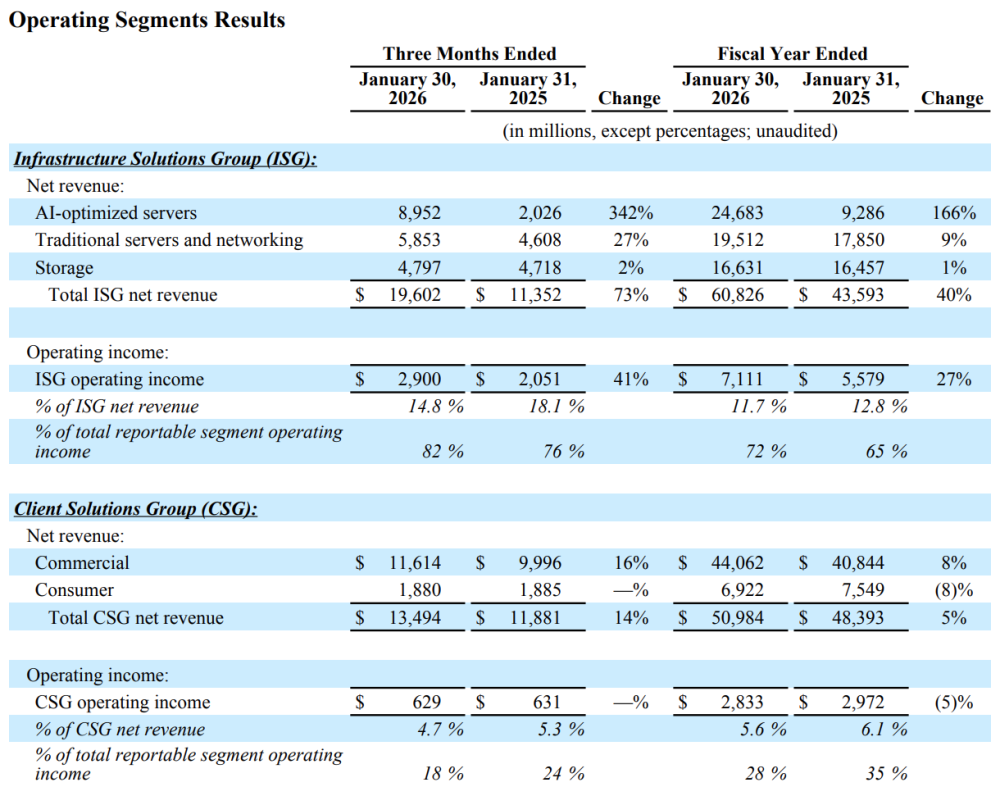 The annual increase in value is roughly equivalent to the Q4 ISG figure ($113B ~ $95B + $19B). ISG revenue reached $60.8 billion in FY2026, up 40% YoY, while Q4 saw even stronger growth, reaching $19.6 billion with a 73% YoY increase.