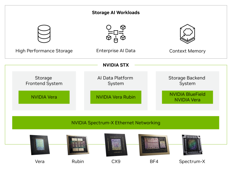 STX is accelerated by the Nvidia Vera Rubin platform and harnesses a new, storage-optimized Nvidia BlueField-4 processor that combines the Nvidia Vera CPU with Nvidia ConnectX-9 SuperNIC, together with Nvidia Spectrum-X Ethernet networking, Nvidia DOCA and Nvidia AI Enterprise software.