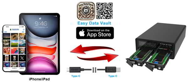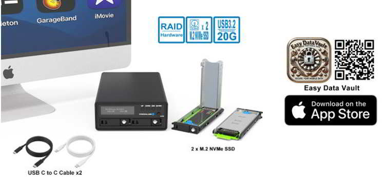 For iPhone and iPad users, Easy Data Vault supports photo and video backup, selective backup, browsing, and restore with compatible USB-C storage. On desktop, the enclosure supports fast hardware RAID workflows across PC and Mac environments.