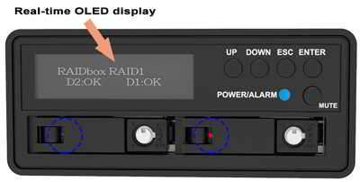 A: The OLED shows RAID mode, drive status, and rebuild progress in real time.