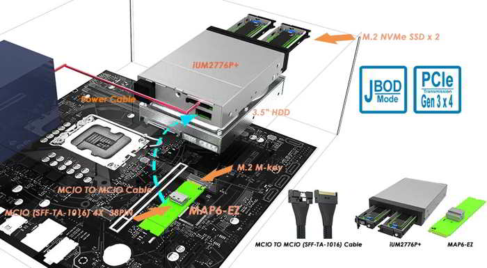 Unlike bare NVMe enclosures, the MiUM2776P+ includes the MCIO adapter and cabling needed for clean PCIe relocation, making it a more complete deployment kit for workstation, server, and edge platforms. It combines the iUM2776P+ dual-M.2 3.5-inch enclosure, MAP6-EZ M.2-to-MCIO adapter, and 50cm MCIO cable into one integrated solution.