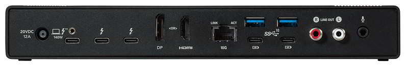 Feature 3xThunderbolt 5 ports, 1x10GbE port, 9x10Gb USB ports, high-resolution audio ports, and 2xvideo outputs, and provide 140 Watts of charging power to laptop computers