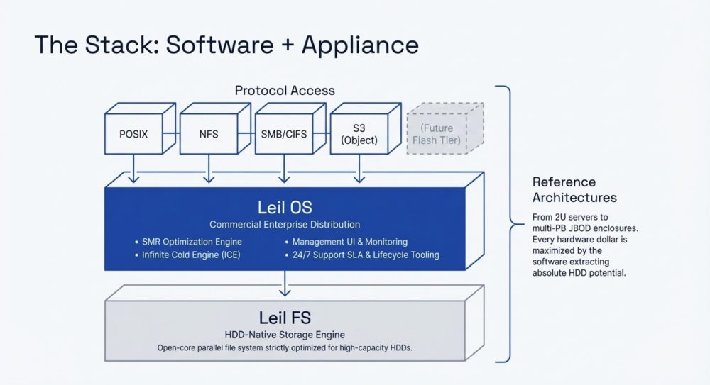 The product stack has two main layers. Leil FS is an open-source, open-core parallel file system strictly optimized for high-capacity HDDs, it drives community adoption and serves as the baseline innovation engine. Leil OS is the commercial enterprise distribution built on top of Leil FS, offering hyperscale-grade efficiency, seamless deployment, a management UI, and 24/7 SLA support. Both are underpinned by the proprietary SMRT Engine, Leil’s core intellectual property.