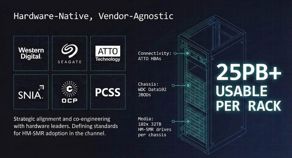 The storage industry faces what Leil calls the “SMR Paradox.” Shingled Magnetic Recording (SMR) drives offer significantly more capacity per disk, and hyperscalers (like Google, Meta, and AWS), representing just 10% of the market, have already adopted SMR at 100% across their infrastructure using custom-built software stacks. However, the remaining 90% of the enterprise market still runs on standard Linux operating systems and has achieved 0% SMR adoption, simply because no accessible, enterprise-grade software exists to manage SMR drives properly.