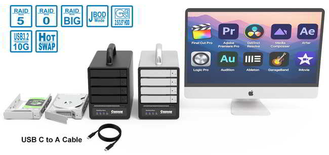Supports RAID-5 for single‑drive fault tolerance, as well as RAID-0, JBOD, and BIG, up to 10Gb/s with compatible USB 3.2 Gen 2 USB-A hosts, and 150W Internal Power