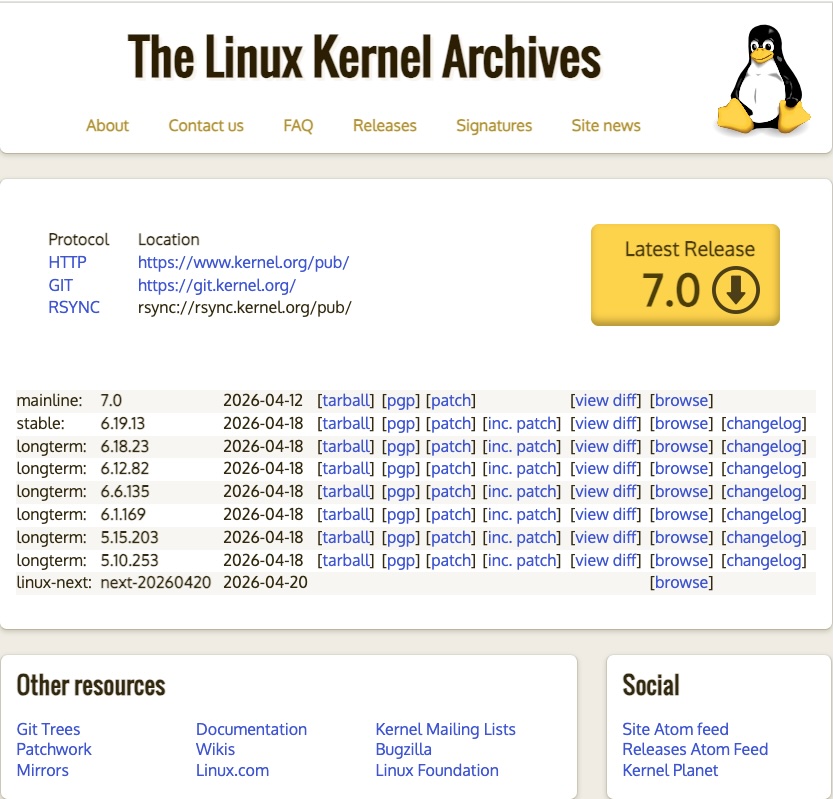 The most recent stable release of the Linux kernel is 7.0, released on April 12, 2026. The major version carries no intrinsic meaning, minor versions are capped around 20 to avoid the false perception that changes between large minor numbers would be smaller than between earlier ones. In short, it follows 6.19 by convention, not revolution.